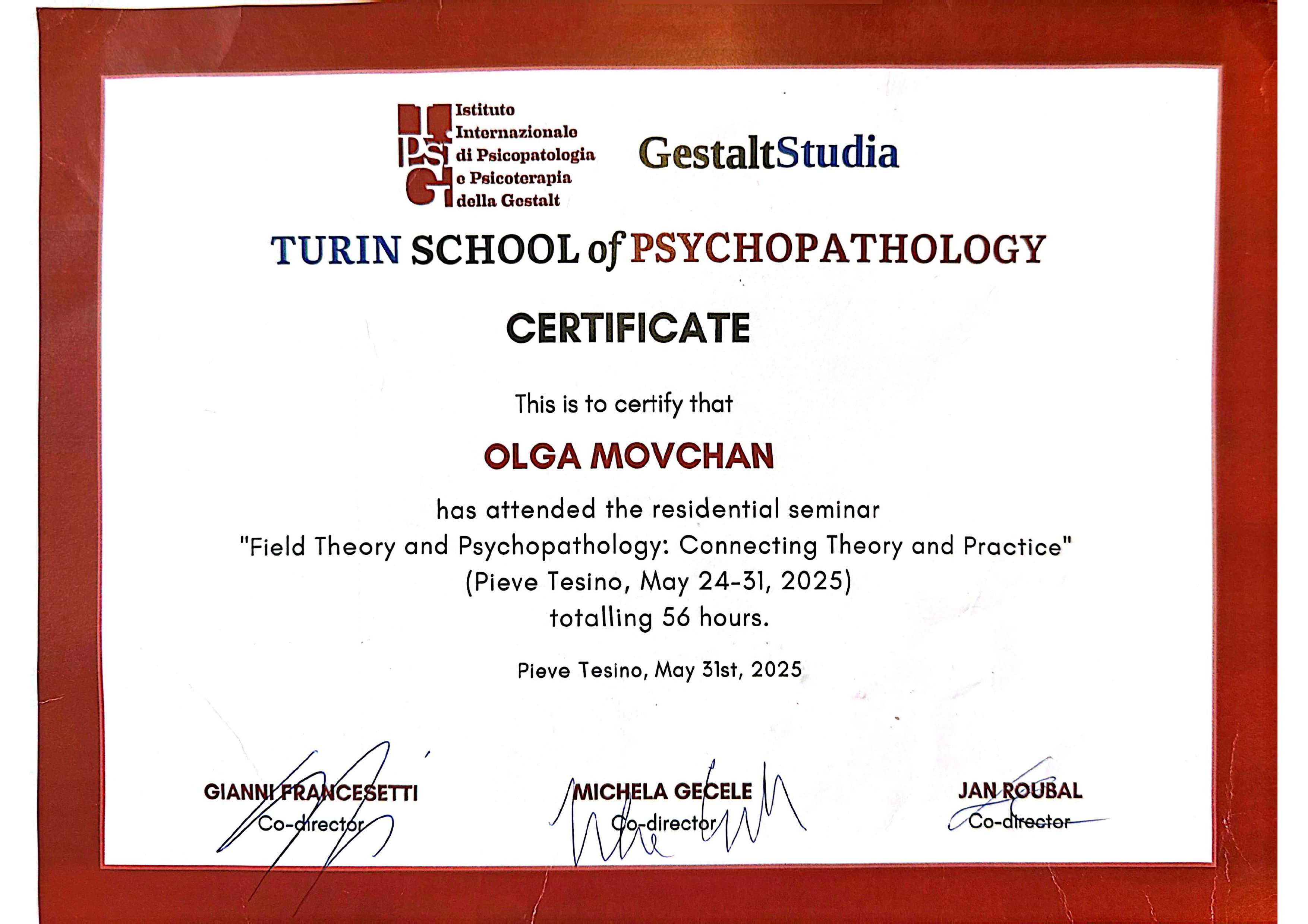 Выпускница 3-й ступени IFGT (французского института гештальт- терапии),